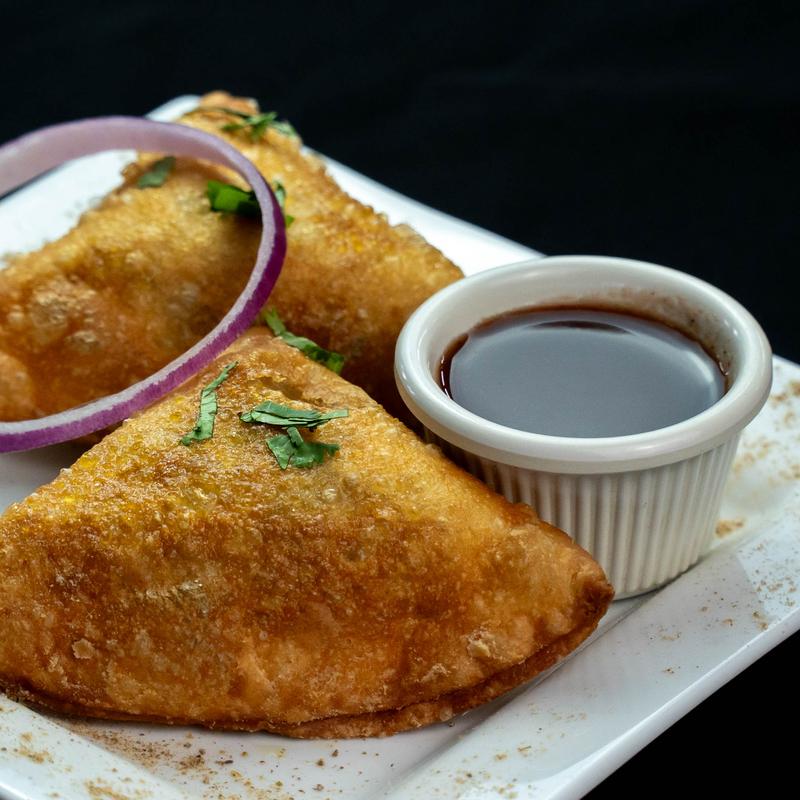 Crispy samosas topped with tangy tamarind chutney, spicy chickpeas, and yogurt.